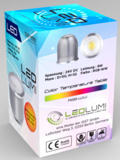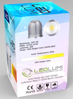 Technische Daten:LED-Spot RGB-WW 52408Nennleistung8 WattFarbtemperaturRGB-WW ( 2700 Kelvin )Spannung24 V DCAbstrahlwinkel60 GradFarbwiedergabeCRI > 92 RaChipEpistarMaterialAluminium/GlasSchutzartIP 20AbmessungenLänge52 mmDurchmesser50 mmLeitungslängeca. 50 mm